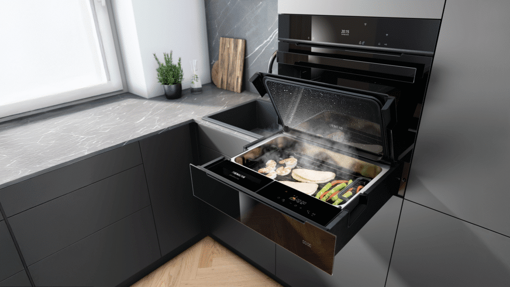 Stoomkoken is al langer ingeburgerd in professionele keukens. Siemens vertaalt dit concept nu naar een compact, veelzijdig inbouwtoestel voor de residentiële markt. Je kan de stoomlade perfect combineren met een iQ700-oven of afzonderlijk onder het werkblad plaatsen. Door zijn strakke design en de flexibele inbouwhoogtes (onder ovens van 60 of 45 centimeter) integreert het toestel moeiteloos in uiteenlopende keukenconcepten.
