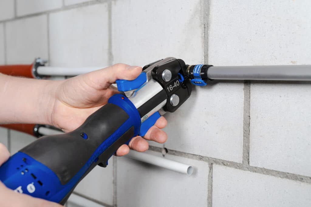 FlowFit van Geberit: omdat je de persklem slechts vanaf één kant naar voren op de fitting hoeft te plaatsen, is de installatie veel comfortabeler.